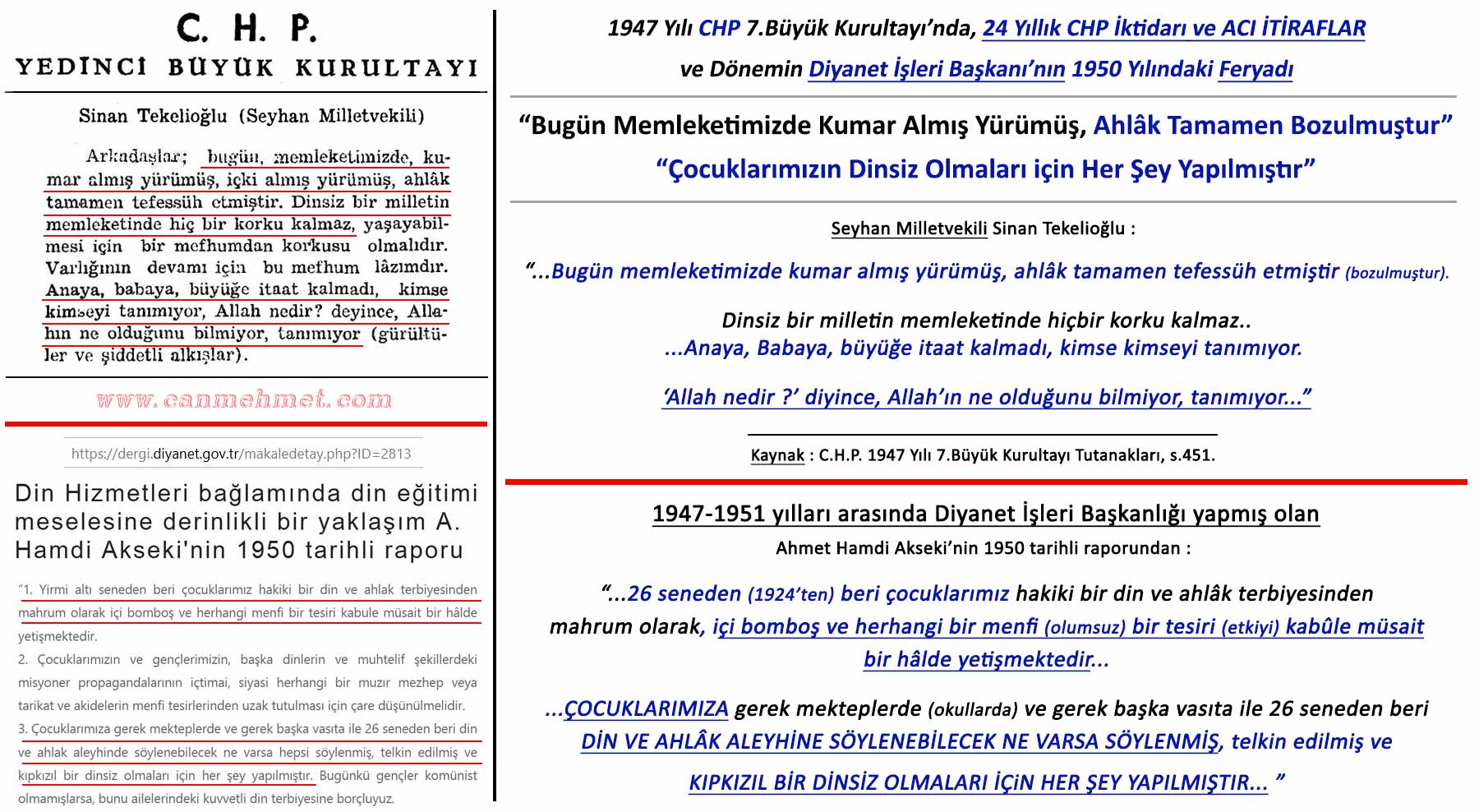 (1)“HIRİSTİYANLIĞIN RESMİ DİN OLMASINI İSTEDİLER”; SP Genel Başkanı Prof. Dr. Mustafa Kamalak, “1924 Anayasası hazırlanırken İslâm’ın yerine Hıristiyanlığın konulması teklif edilmiştir. O günkü şartlarda Atatürk bunu kabul etmemiştir. Mahmut Esat Bozkurt bu konuyu Meclis kürsüsünden gündeme getirmiştir. -Bozkurt, ‘İslâm terakkiye manidir. İslâm kaldıkça yüzümüze kimse bakmayacak. Bu yüzden Hıristiyanlığı yazmalıyız’ demiştir. Sonraki süreçte ezan yasaklanmış ve Kur’an suç aleti haline getirilmiştir. Ezanı Arapça okuyanlar bile cezalandırılmıştır. Şu andaki terörün, bölücülüğün ve tinerciliğin temelinde bunlar vardır” dedi.