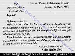 -“Muhterem efendim. Mektubunuzu aldım. Biz her ne şekil suretle olursa olsun memleket dahilinde dini neşriyat yapılarak dini bir atmosfer yaratılmasına ve gençlik için dini bir zihniyet fideliği vücuda getirilmesine taraftar değiliz. Zat-ı âlilerinin herkesçe de müsellüm olan ilim ve faziletine hürmetkârız. Ancak günün bu kabil neşriyata tahammülü olmadığını siz de takdir edersiniz.